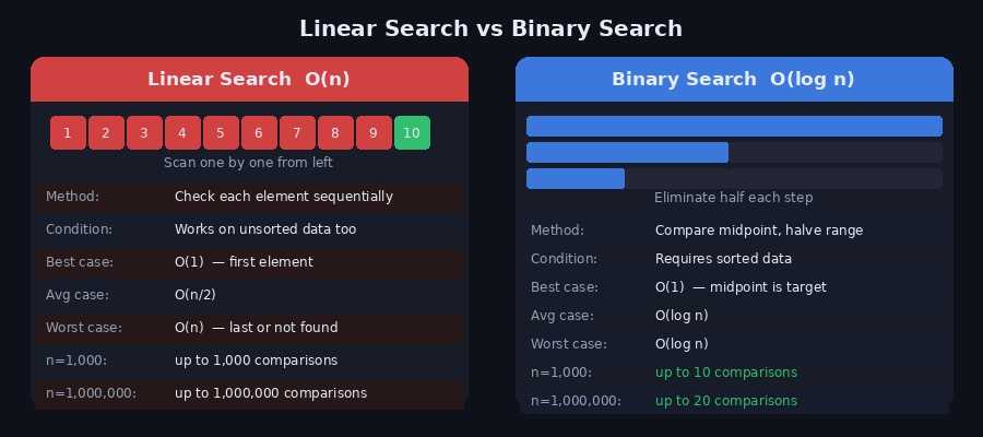 선형 탐색은 처음부터 하나씩 비교하는 O(n) 방식인 반면, 이진 탐색은 매 단계마다 탐색 범위를 절반으로 줄이는 O(log n) 방식입니다.