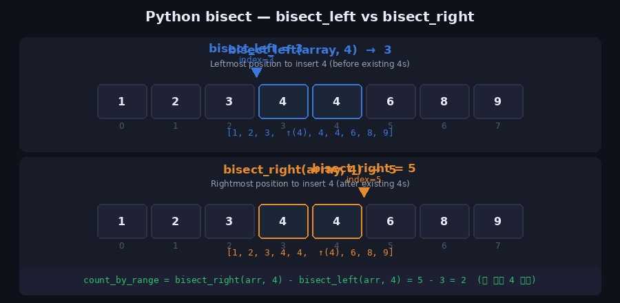 print(count_value(arr, 5)) # 0 ← 5가 없음5. Python bisect 라이브러리