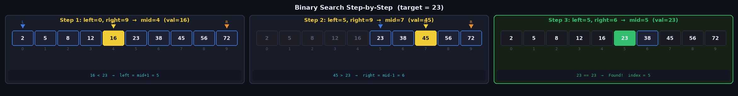 배열 [2, 5, 8, 12, 16, 23, 38, 45, 56, 72]에서 target = 23 을 찾는 과정입니다.