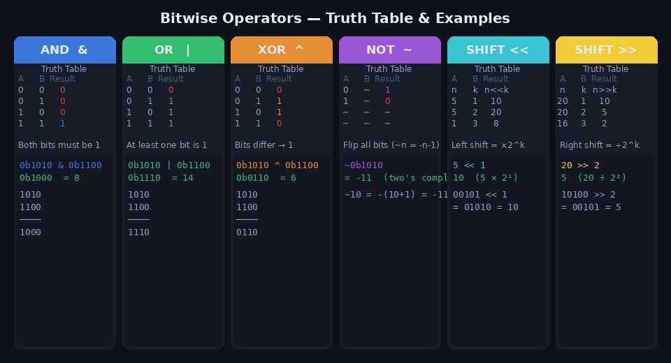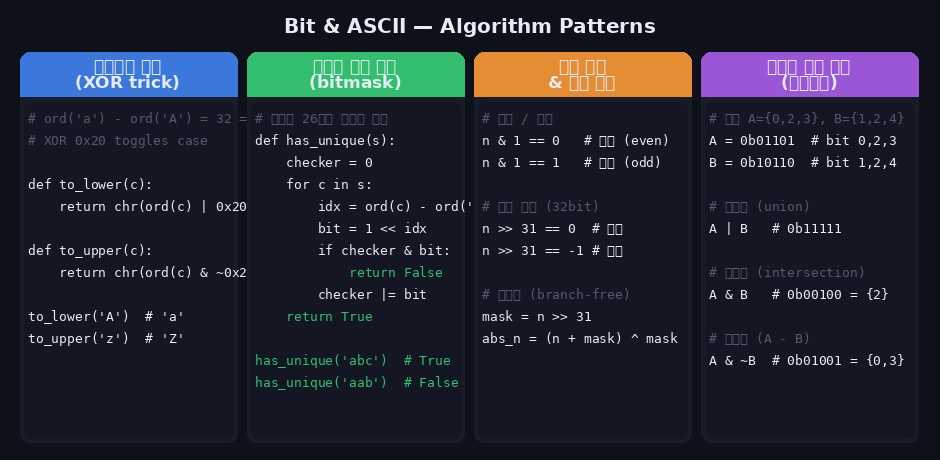 비트 연산과 아스키코드 변환은 코딩테스트에서 단골로 등장하는 테크닉입니다. 특히 비트마스킹은 집합을 정수 하나로 표현해 상태 압축 DP나 방문 체크에 활용되고, 아스키코드는 문자를 숫자처럼 다룰 수 있게 해줍니다. 두 개념을 함께 익히면 문자열과 정수를 넘나드는 문제를 훨씬 간결하게 풀 수 있습니다.