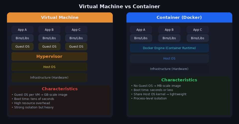 └── Container 3: Bins/Libs + App C (수 MB)| 비교 항목 | VM | Container |