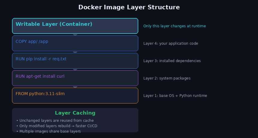 Docker 이미지는 여러 레이어가 쌓인 구조입니다. Dockerfile의 각 명령어가 하나의 레이어가 됩니다.