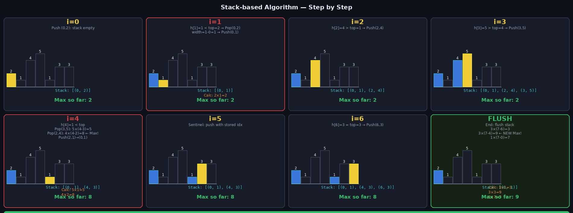 (이전에 팝된 막대들은 h[i] 높이로 왼쪽으로 확장 가능)단계별 시각화