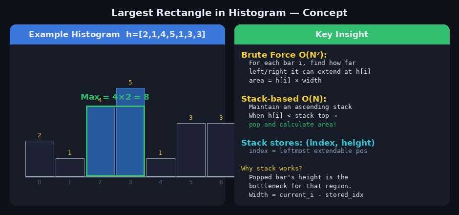 각 막대 h[i]를 "이 높이로 만들 수 있는 직사각형의 높이"로 사용한다. 막대가 감소하는 순간(h[i] < 스택 top), 더 높은 막대들의 직사각형을 확정 지을 수 있다.
