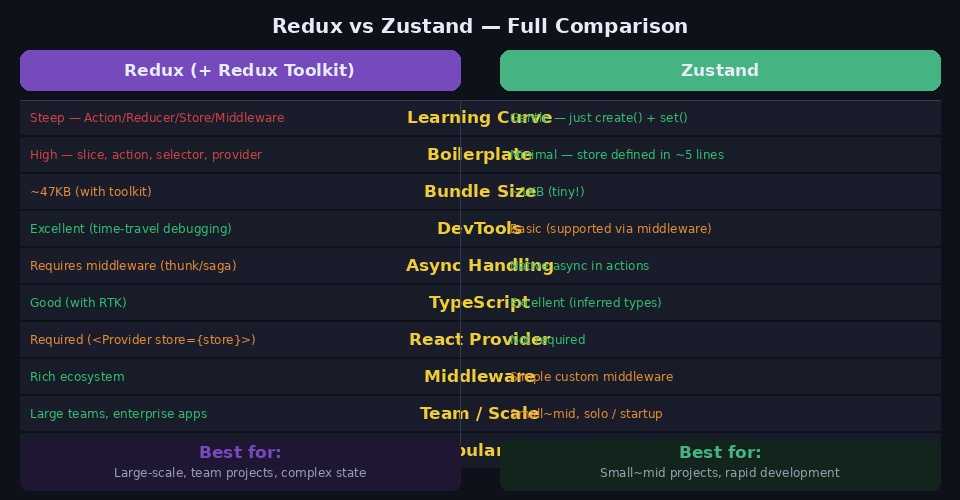 | 비동기 처리 | 미들웨어 필요 (thunk/saga) | 액션 안에서 바로 async/await |
