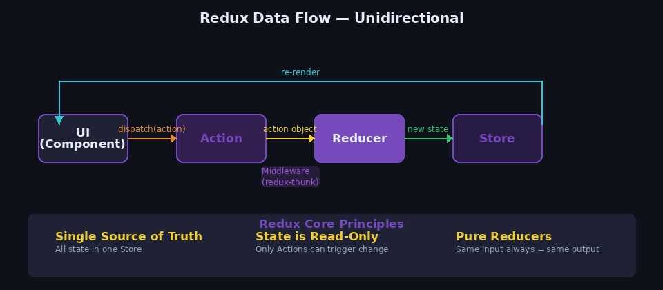UI → dispatch(action) → Reducer → Store → UI 리렌더링- Action: 상태 변경을 설명하는 객체