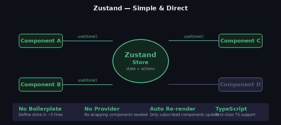전역 Store에 상태를 두고 필요한 컴포넌트가 직접 구독합니다. 중간 컴포넌트를 거칠 필요가 없습니다.