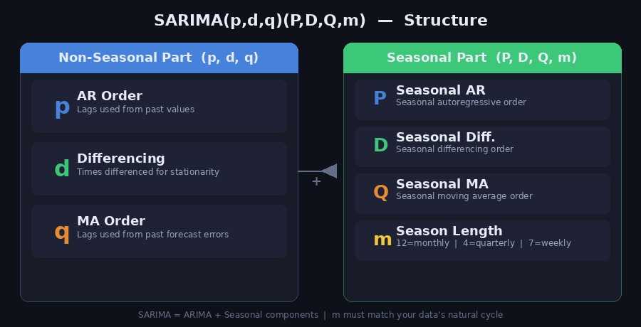 - 소문자 p, d, q: 비계절 ARIMA 파라미터 (위와 동일)