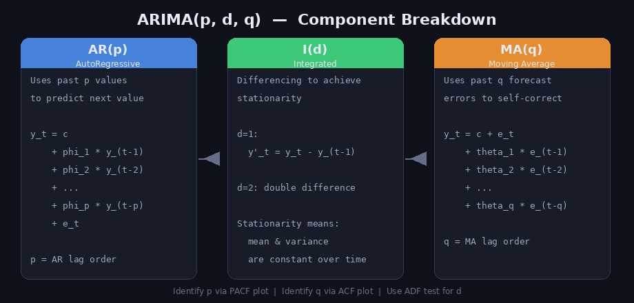 ARIMA(AutoRegressive Integrated Moving Average) 는 시계열 분석에서 가장 널리 쓰이는 통계 모델입니다. 세 가지 구성 요소의 조합입니다.