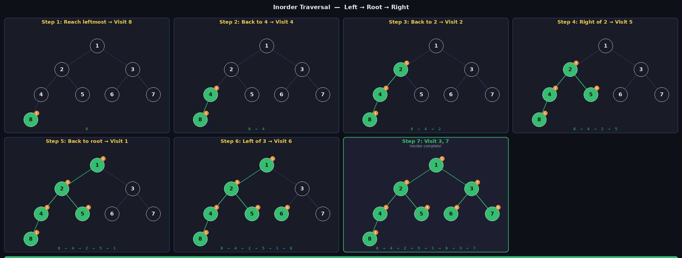 | 중위 순회 | Left → Root → Right | 8 4 2 5 1 6 3 7 |