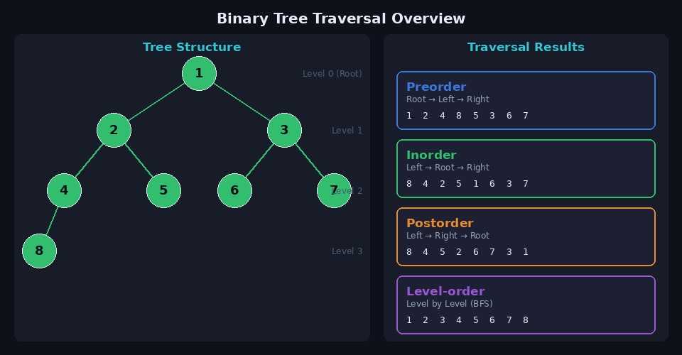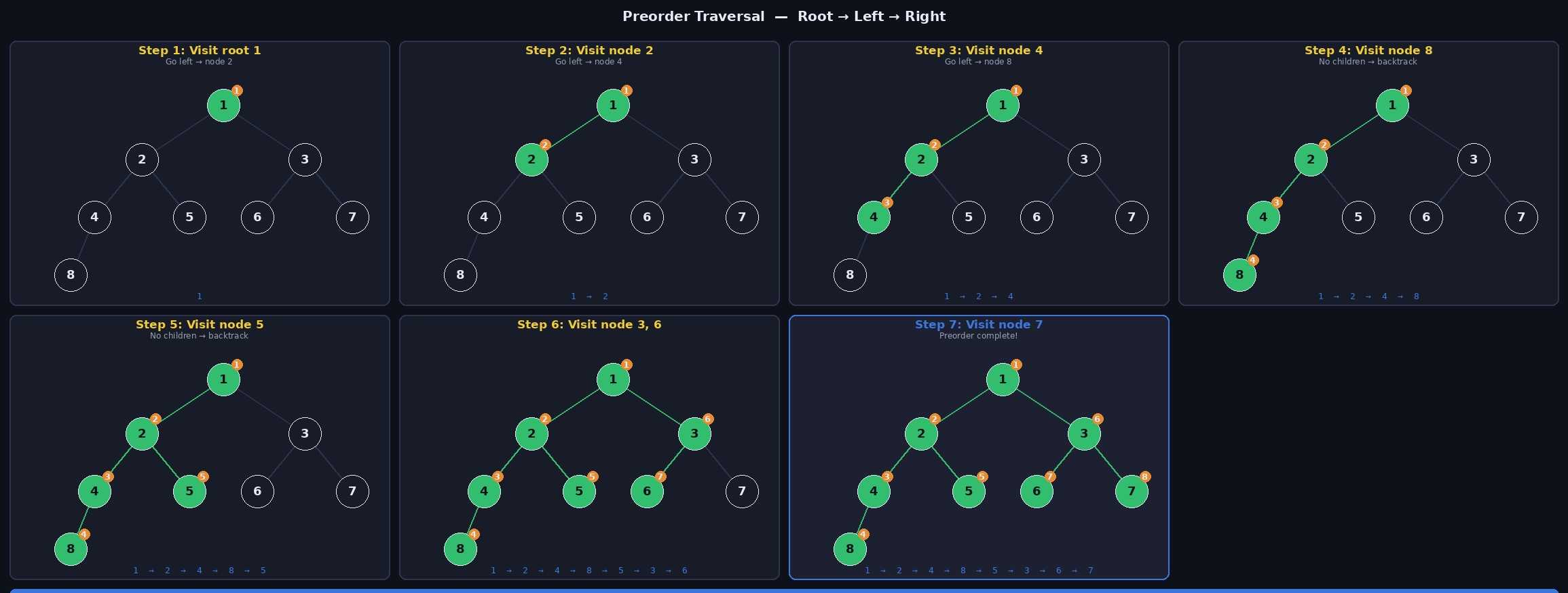 | 전위 순회 | Root → Left → Right | 1 2 4 8 5 3 6 7 |