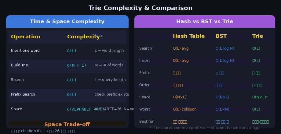 | 전체 구축 | O(M × L) | M = 단어 수, L = 최장 단어 길이 |
