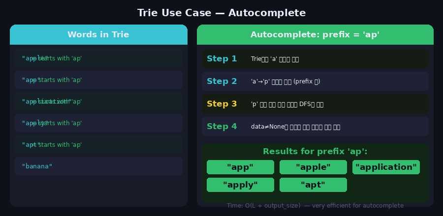 trie.starts_with('a') # True — 'a'로 시작하는 단어는 있음6. 자동완성 구현