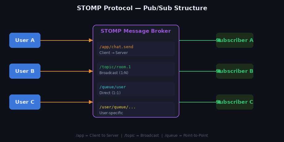 Spring 환경에서는 STOMP(Simple Text Oriented Messaging Protocol)를 함께 사용하는 것이 일반적입니다. Pub/Sub 구조로 채팅방, 브로드캐스트를 쉽게 구현할 수 있습니다.