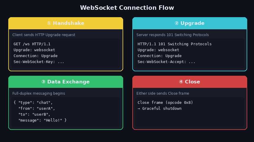 }④ Close: 어느 쪽이든 Close 프레임을 보내 연결을 종료합니다.