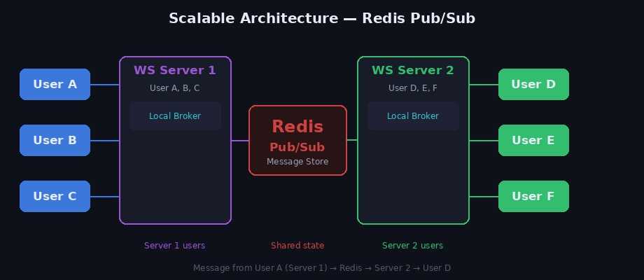서버가 단일 인스턴스일 때는 SimpleBroker로 충분하지만, 서버가 여러 대로 늘어나면 문제가 생깁니다. User A가 Server 1에 연결되어 있고 User B가 Server 2에 연결되어 있으면, Server 1에서 보낸 메시지가 User B에게 도달하지 않습니다.